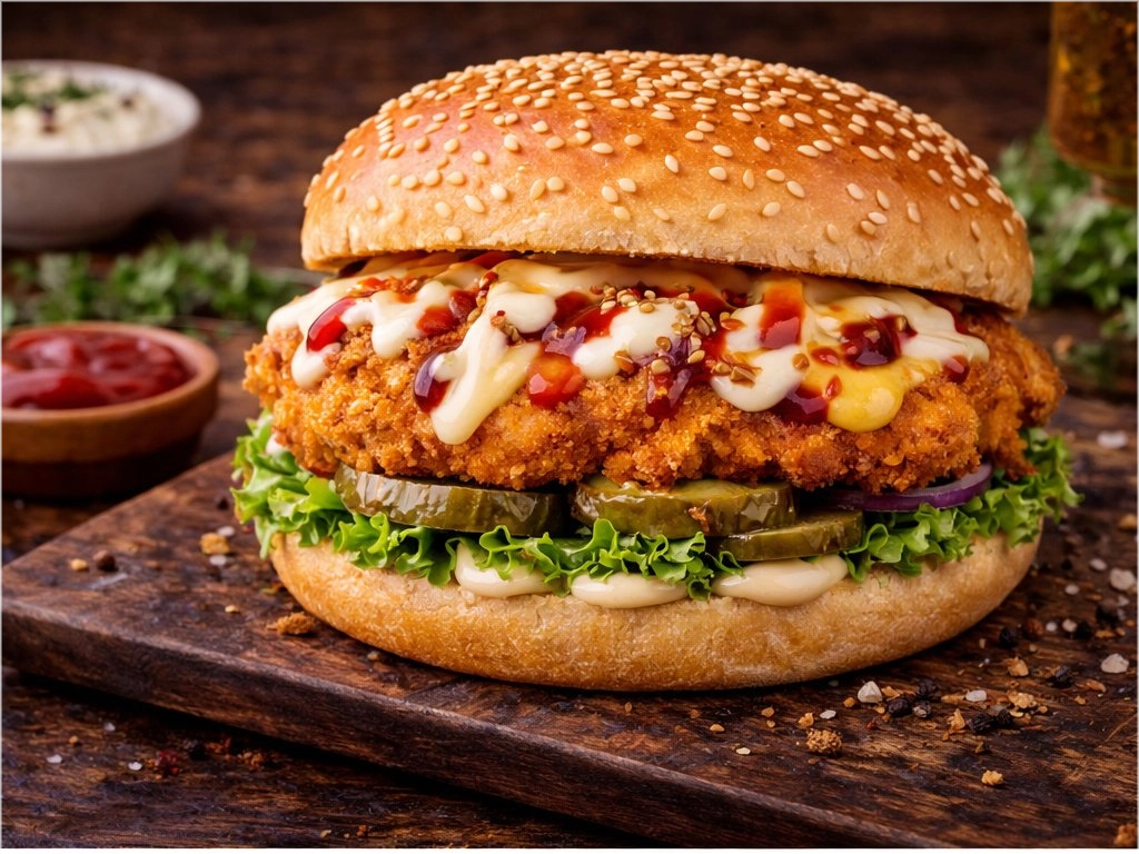 Crispy chickenburger op broodje met verse toppings: sla, tomaat, ui, augurken, cheddar.0
